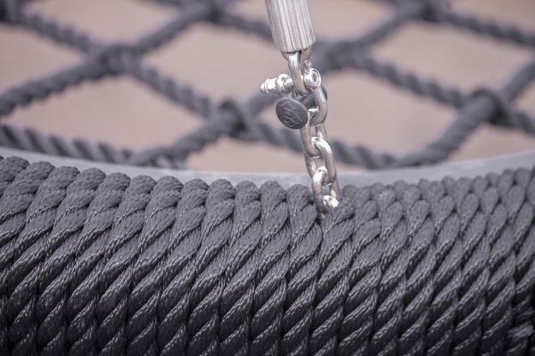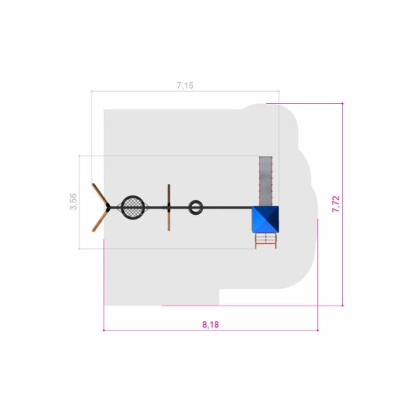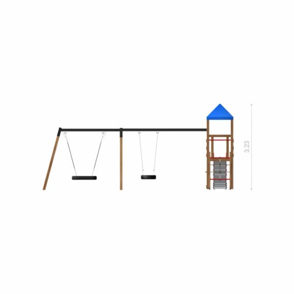 A termék szerkezete magas minőségű anyagokon alapul, mint például tartós vörösfenyő és porfestett acél váz, amely biztosítja az egész szerkezet stabilitását. Az erősített polipropilén kötelek és rozsdamentes acél elemek használata növeli az időjárásállóságot. A plastizol bevonatok védenek a korrózió és a mechanikai sérülések ellen, így a termék hosszú élettartamú megoldást nyújt bármely játszótér számára.