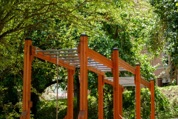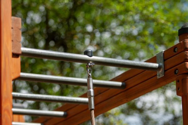 A termék a legmagasabb minőségű anyagokból készül, mint például vörösfenyőfa és horganyzott acél, ami biztosítja a hosszú élettartamot és az időjárási viszontagságokkal szembeni ellenállást. Az erősített polipropilén (PP) kötelek és HDPE elemek használata tovább hangsúlyozza az eszköz szerkezeti szilárdságát. Mindezek az anyagok együtt egy stabil, intenzív használatot is kiálló konstrukciót hoznak létre.