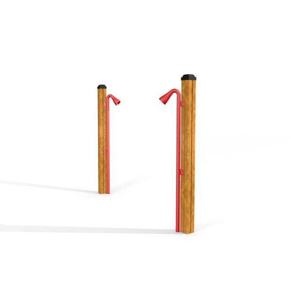 A Megaphone egy masszív szerkezet, amely kiváló minőségű anyagokból készült. A középpontban két időjárásálló vörösfenyőből készült faoszlop található, amelyek tartósságot és elegáns megjelenést biztosítanak. A porszórt fém alkatrészek megvédik a korróziótól és a mechanikai sérülésektől, míg a HDPE elemek színes hangsúlyt és szívósságot adnak hozzá.