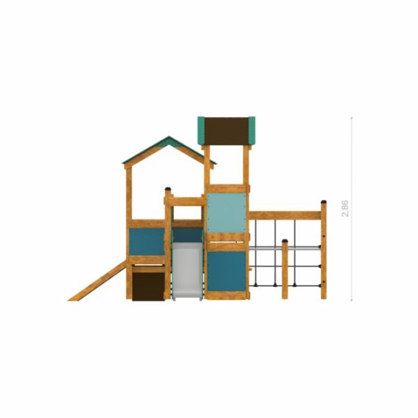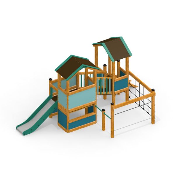 A Tower Nature fa játszóház csúszdával tökéletesen illeszkedik akár a parkok sétányaihoz, akár magánkertekhez vagy szabadidős területekhez. Az olyan formagazdagságok, mint a két torony közötti híd vagy a mászóháló ösztönzik a gyerekeket a felfedezésre és a fizikai ügyesség fejlesztésére biztonságos környezetben.